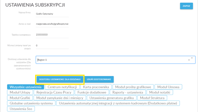 - Kliknij przycisk Dostosuj ustawienia dla oddziału.