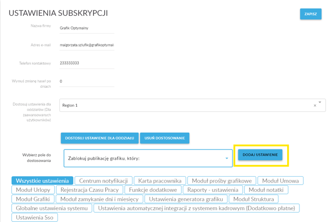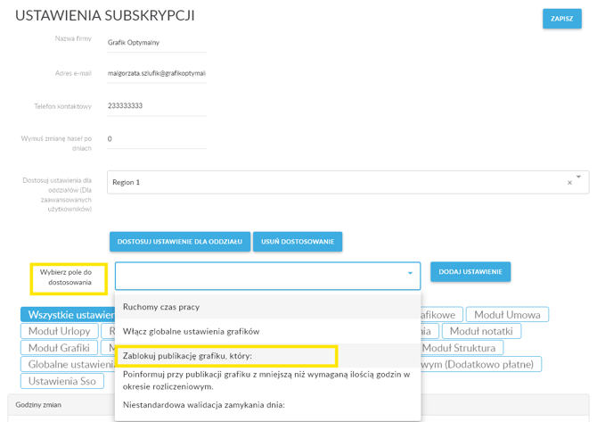 - W sekcji pole do dostosowania wybierz z listy "Zablokuj publikację grafiku, który".