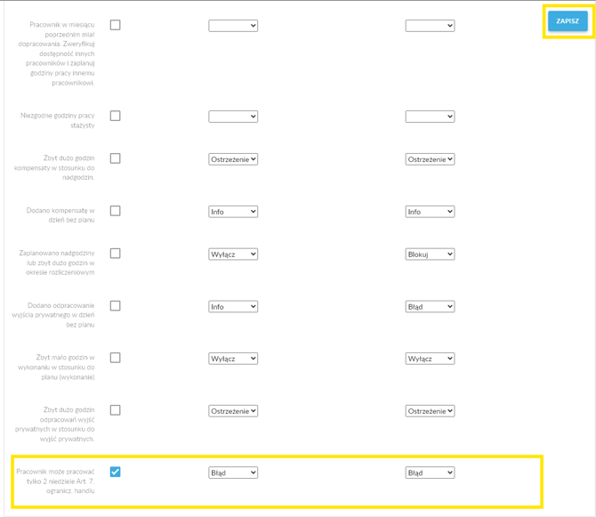 - Zaznacz checbox przy ustawieniu max 2 niedziele pracujące.