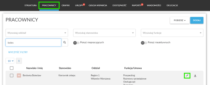 - Kliknij ikonę ołówka, aby przejść do kartoteki pracownika.