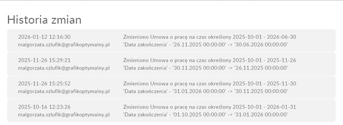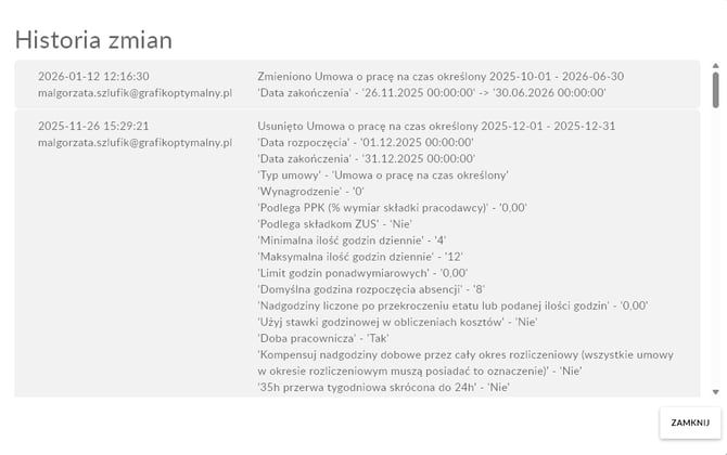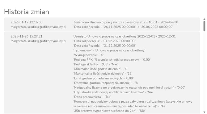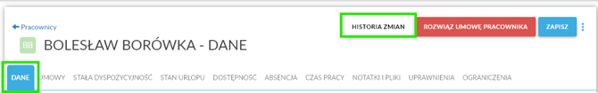 Historie zmian możesz sprawdzią w szczegółach kartoteki pracownika w zakładkach: