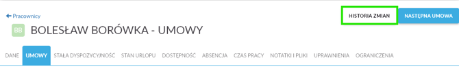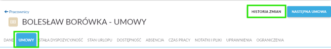 - W zakładce Umowy kliknij przycisk Historia zmian.