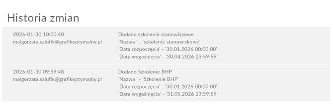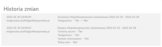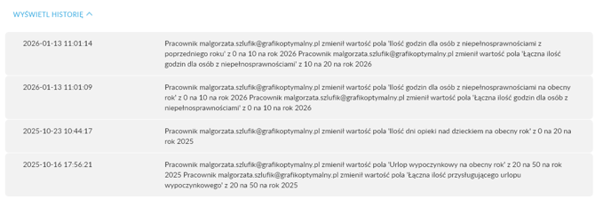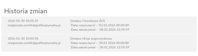Historia zmian w zakładce Absencje oraz Uprawnienia jest rejestrowana od dnia 29.01.2026.