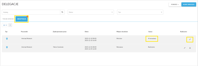 - Kliknij przycisk Edytuj znajdujący się przy delegacji, którą chcesz zaakceptować.