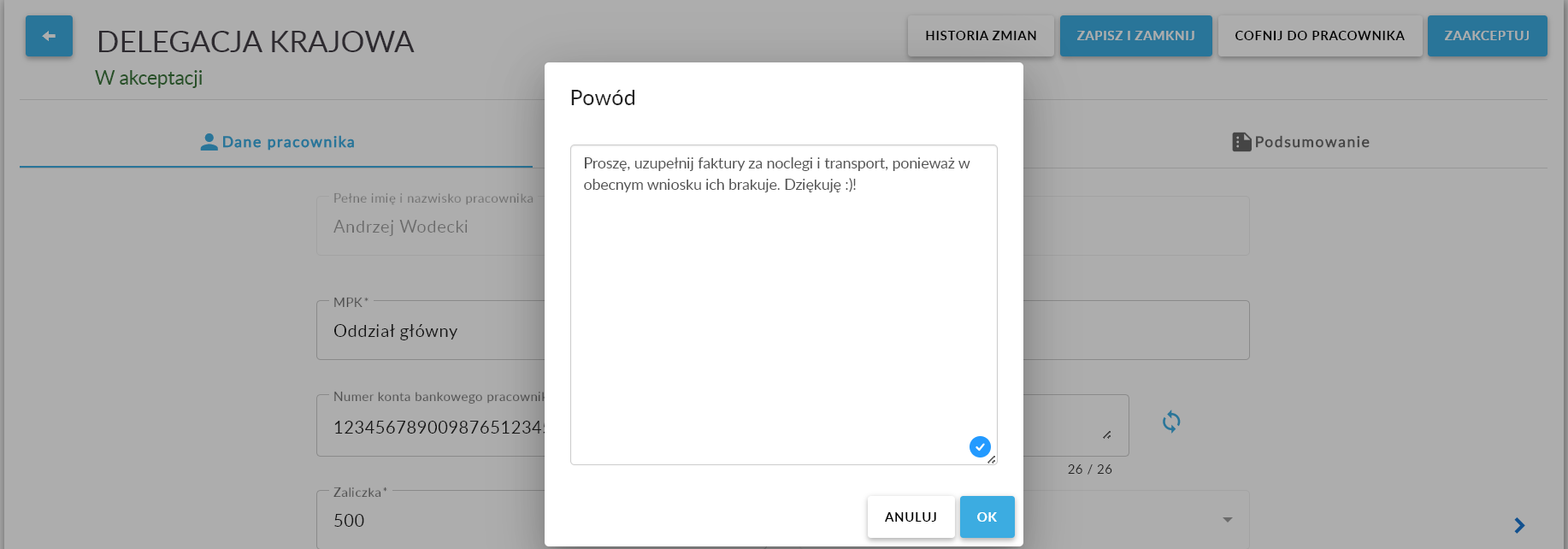 - Jeśli zauważysz, że wniosek o rozliczenie delegacji zawiera błędne dane, możesz odesłać go do poprawy, klikając przycisk Cofnij do pracownika. Taka delegacja, trafia ponownie do wersji roboczej. Po kliknięciu przycisku cofnij do pracownika, pamiętaj, aby wskazać powód jej odrzucenia.