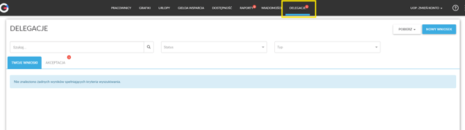 Jeśli Twój pracownik złoży wniosek o rozliczenie delegacji, w zakładkach Delegacje i Akceptacja zobaczysz czerwony symbol. Oznacza on, że masz oczekujące wnioski do akceptacji.