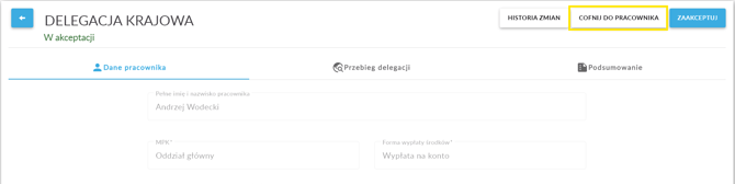 - Jeśli zauważysz, że wniosek o rozliczenie delegacji zawiera błędne dane, możesz odesłać go do poprawy, klikając przycisk Cofnij do pracownika. Taka delegacja, trafia ponownie do wersji roboczej. Po kliknięciu przycisku cofnij do pracownika, pamiętaj, aby wskazać powód jej odrzucenia.