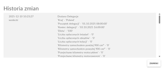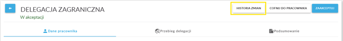 - W szczegółach każdego wniosku możesz sprawdzić pełną historię – wszystkie operacje wykonane przy tym wniosku zarówno przez pracownika, jak i przez Ciebie. Aby ją otworzyć, kliknij przycisk Historia zmian.