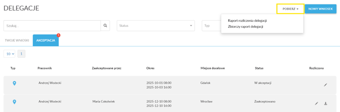 - Z poziomu listy wniosków o rozliczenie delegacji, możesz pobrać, Zbiorczy raport delegacji oraz Raport rozliczenia delegacji. Aby to zrobić, kliknij przycisk Pobierz.