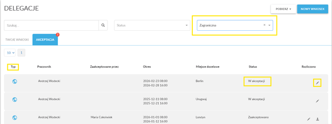 - Kliknij przycisk Edytuj znajdujący się przy delegacji, którą chcesz zaakceptować.