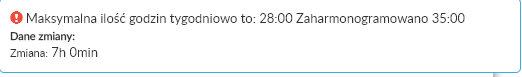 - Jeśli zaplanujesz o jeden dzień roboczy więcej, jak w innych tygodniach kodeksowych, które najczęściej trwają 5 dni roboczych, a limit godzin to 35h, system wyświetli błąd i nie będziesz mógł opublikować grafiku w tej formie.